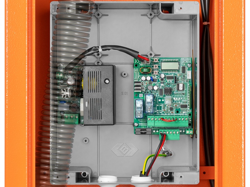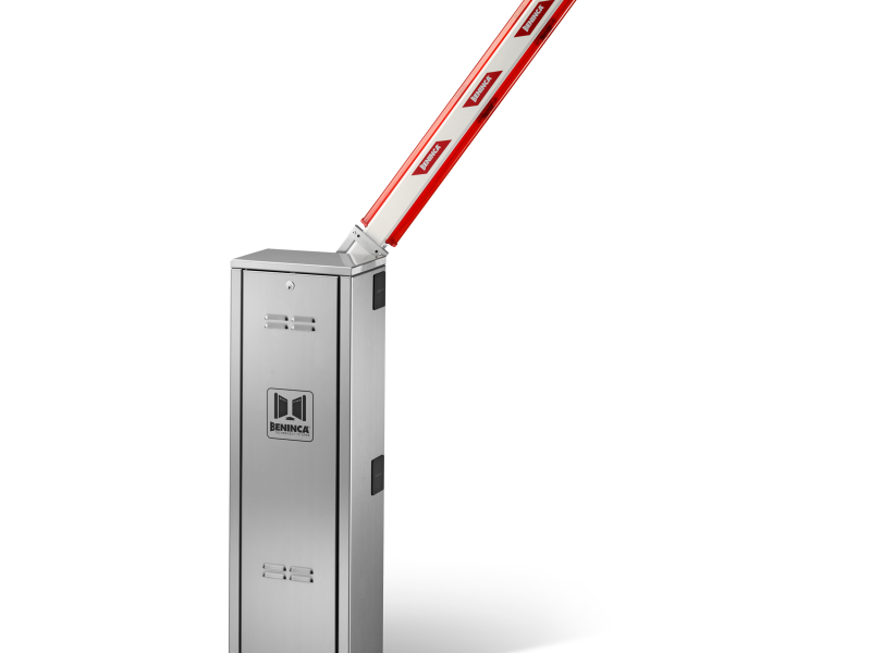 • Barrière électromécanique 24 Vdc pour usage intensif, équipée d’une centrale de commande avec récepteur et chargeur de batteries intégrés, alimentateur à commutation universelle switching de 100 à 250 Vac, 50/60 Hz